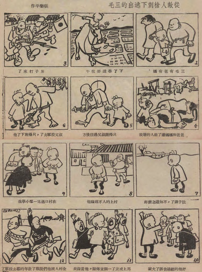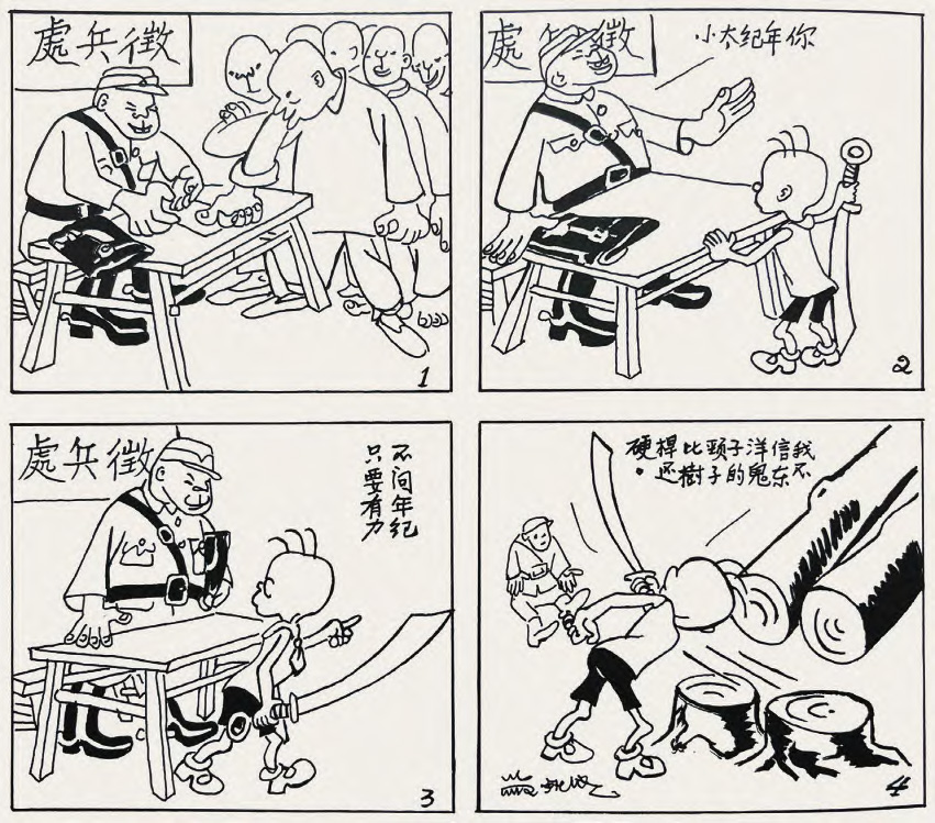 13日淞沪会战打响后,上海漫画界迅速响应,组织成立上海抗敌后援会漫画界救亡协会,当时已借“三毛”形象誉满全国的漫画家张乐平成为协会下属漫画宣传队的副队长,配合抗日战争开展漫画创作和宣传活动。 张乐平在此次展览中展出了其战争宣传漫画的代表作《救国公债》, 该作中绘画主体要素造型精致、结构准确,同时将一个完整的主题叙事在单画面中很好地表达了出来。作品构图张弛有度,画面底部塞满一排排的炮弹,炮弹上的高光、暗面与轮廓兼具夸张性与写实性,底部左侧是两个操作大炮进行战斗的军人,他们表情生动、造型准确。天空中有一团以细致的明暗色调描绘出的升起的硝烟, 旁边几个日本侵略者被炸上天,侵略者的军服、旗帜、断臂飘在空中…… 展览中不乏叶浅予、梁白波、张仃等画家的优秀作品,但《救国公债》依旧是展览中最为杰出的作品之一,被当时的媒体封为“大师之作”。〔3〕 漫画的宣传倾向在战时有显著的增强。一方面出于宣传的需要,另一方面也出于对战况的适应,大部分上海滩的漫画家直接放弃了自己一手塑造的漫画形象,例如叶浅予的“王先生与小陈”、梁白波的“蜜蜂小姐”……而张乐平则不然,他在介入战争的早期阶段曾继续创作“三毛”题材漫画,尝试对它进行调整以适应战时的宣传需要。1938年在武汉时,张乐平分别于《抗战漫画》的第2、第3期发表了《三毛的大刀》和《三毛的爸爸》,又在第6和第10期分别发表了《可以智取》与《从敌人枪刺下逃出的三毛》,共四组“三毛”漫画。此后张乐平对“三毛”形象的创作戛然而止,在接下来的七年中几乎没有再绘制过 “三毛”形象,直到重返上海后才恢复对“三毛”系列的创作。 二、战时“三毛”漫画的图像转型 在战时语境下,“凡是以宣传鼓动为目的的绘画,都可称为宣传画”〔4〕。从内容上看,抗战时期的“三毛”漫画中,除了《可以智取》是张乐平一贯采用的社会现象讽刺漫画外,其余几件明确显示出张乐平在介入战争宣传伊始, 增强“三毛”漫画宣传性的尝试。《三毛的大刀》和《三毛的爸爸》,显然是张乐平试图以“三毛”形象广泛的群众基础,为征兵工作提供宣传。《三毛的大刀》描绘了三毛在抗日征兵处坚决要求报名参军上前线杀敌的情景,当征兵官认为三毛年纪太小而拒绝他时,三毛称“不问年纪,只要有力”,同时举起大刀一口气砍倒了两棵大树(图1)。《三毛的爸爸》讲述三毛爸爸见到壮年男性全员征兵的公告后,当征兵处的人来到家中时假扮女性在家中做女红缝补,妄图逃脱兵役,后被三毛揭穿的故事。《可以智取》则通过三毛为灾民募捐受到富人无视的故事,表达对于权贵者漠视他人悲惨遭遇的反思。 其中《从敌人枪刺下逃出的三毛》尤为特殊,它以三毛为主角,用12幅画面组成的连环漫画讲述小三毛的父母被日军杀害后,他无人照料,后与小朋友们组成漫画宣传队,说服村里的壮年男子去投军抗日的故事。(图2)这则故事明显带有漫宣队的自传意味,将“三毛”形象和漫宣队的成立过程联系 图1 张乐平 三毛的大刀 漫画 1938 在了一起,幼年三毛的经历恰好成为漫宣队成立背景的叙述载体。虽然张乐平在漫画创作中大量将现实生活中发生的事件作为漫画情节的来源,但一方面成年人与儿童的生活世界存在着较大差异,另一方面张乐平在多数情况忠实于观察和记录,因此在“三毛”作品中体现的现实主要是生活化的趣事,在以往的“三毛”作品中极少见到张乐平将自身经历置入作品的例子。此外,更为重要的方面则是图像的转变。《从敌人枪刺下逃出的三毛》采用了一种高度简化概括的作画方法,张乐平舍弃了所有的阴影和灰部,画面上只有着色和不着色两种区分。当然,被画家们广泛使用的线描也是仅有着色与不着色的区别,但这件作品的特殊之处在于,它采用的不是线描般粗细一致的线条。我们可以明显地看到张乐平在这件作品中的线条有粗有细。要表现体积较大者,便加粗线条的宽度,如第二幅图“下了学还要牧牛”中田埂远处的山;要表现大块深色的地方,则直接把块面涂黑,如深色的衣服及第四幅图“爸爸和妈妈遭了敌人的屠杀”中的血迹。这种剧烈的图像转型事实上是张乐平创作变化的直接反映。 从艺术性出发很难解释上述改变,因为从绘画层面来说,这样的创作方法丢失了许多的细节,与画家们磨炼技法努力追求的艺术创作效果是背道而驰的。我们不妨以不同时期的“三毛”为例进行说明。创作早期“三毛”形象时,张乐平对于这一形象还未有成形的考虑,在《图画晨报》发表的“三毛”漫画一方面缺少客观环境的细节描绘,另一方面在人物造型上比例并不精准,细节的塑造也略显稚嫩。到漫宣队成立以前,“三毛”漫画的图像已相当之成熟,此种成熟体现为作品日益丰富的绘画细节,包括孩童的比例动态、服装配饰、周边景物等。如《蒋三毛爱国未遂》便是一则非常精彩、充满细节的多格漫画, 作品中三毛和同伴孩子的头盔、服装都有灰部示意色彩,三毛的服装更是以细腻的笔画描绘出毛衣的质感,这些细节无不显示出艺术家在绘制人物时精湛的速写线条技艺和纯熟的配色技法。而到了战争之时,这些细节却在“三毛”作品中一下子失去了。比如《从敌人枪刺下逃出的三毛》中,小三毛的形象与《蒋三毛爱国未遂》中