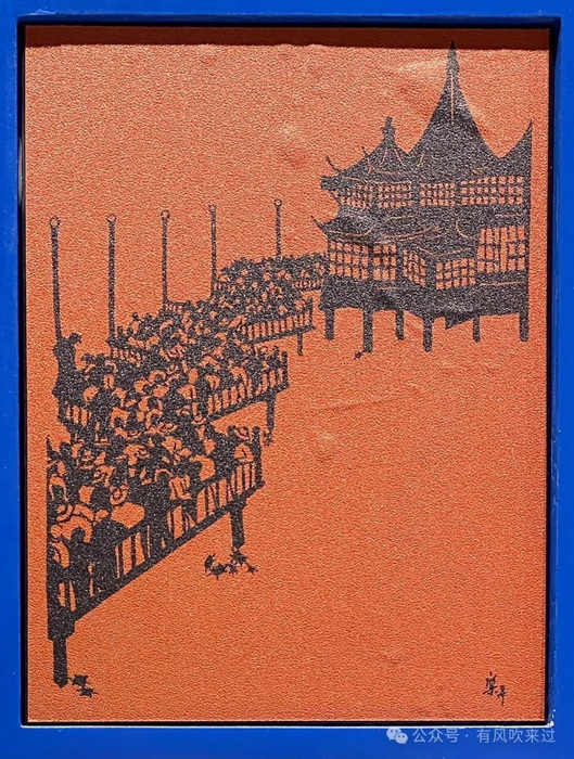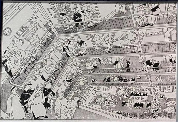 他还能剪纸,非常现代: 1935年2月,大除夕的城隍庙九曲桥 (百日苦后,一日乐,挤一个水泄不通) 桥上的人密不透风,桥下小龟悠闲游荡,好不有趣! 这居然是一刀一刀剪出来,真是厉害。 黄永玉见过张乐平创作剪纸,说:他拿一张纸,不打稿子就能剪出人来,剪一队死人的仪仗,打锣打鼓吹号过去,剪一队讨媳妇的坐着花轿的过去,两队连在一起的,人物重重叠叠,不打稿就能剪出来,一大张纸这么剪。就是说在表现力上很有天份,这个太奇怪了,很少很少有,几乎是没有第二个人这样做。 他的漫画也可以很复杂: 1937年3月,大饭店 上海众生相,有的表情生动、有的不见五官,但个个精彩形象,汇集于大饭店的几层楼道里。如此复杂的大场景漫画,在20世纪30年代极少见到。 同为漫画家的丁聪就说:乐平的漫画,不仅画人物的表情动作,神气十足,变化多端,而且画小动物也都生动活泼,情趣可爱。他还擅长处理人物众多的大场景漫画。我佩服他的画构思巧,技巧高。可他从来不以此傲人。 看这幅1939年秋天的创作: 我们从小看到大的抗日剧,我敢说,都是按这找的演员!