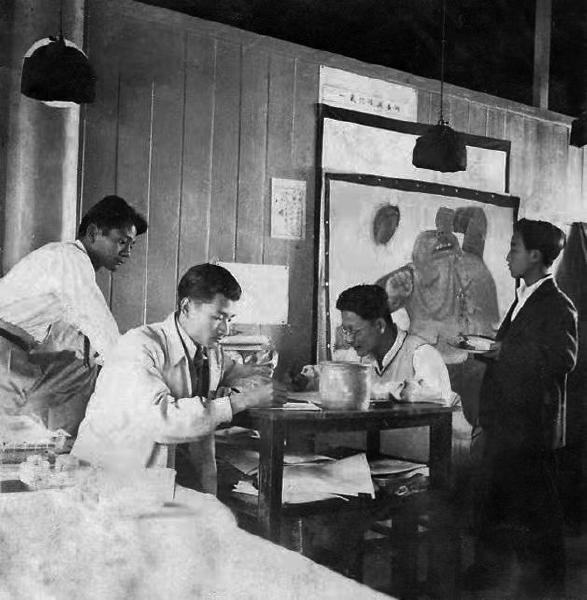 抗战期间,张乐平(左二)在进行漫画创作。