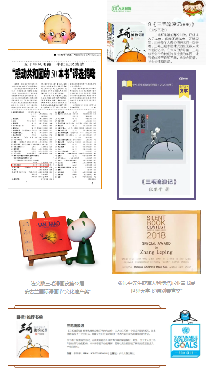 三毛漫画获得的荣誉(部分) 三毛漫画图书还被翻译成英文、韩文、越南文、法文、意大利文、西班牙文等多语种版本在国外出版发行。张乐平的作品展示了中国漫画艺术的独特魅力,三毛的故事折射出中国近代历史的波澜壮阔。三毛已超越漫画本身,成为中国文化的一张名片。