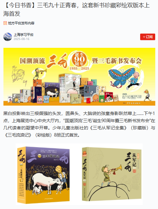《三毛学雷锋》(彩绘版) 因其积极的品格引导意义,入选了“微笑彩虹”主题出版类图书。 这份认可的热度,从书页间延伸至了更广阔的公众视野。今年,我的名字与故事频繁地出现在新华社、学习强国、解放日报、新民晚报、澎湃新闻等权威媒体和平台上。在专业领域,《中国新闻出版广电报》、《出版人》杂志、出版商务网等行业媒体对我也多次进行深度报道。这些来自四面八方的关注与褒奖,让我深深地感到,一个真诚、善良、乐观的形象所承载的力量,能够穿越漫长时光,持续叩响时代的心弦。